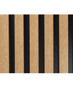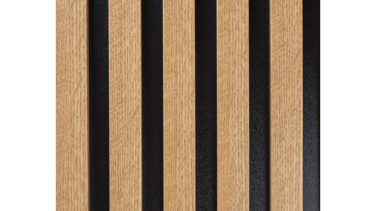 - Panel o wymiarach 275x40,5x1,46cm składający się z 9 szt. lameli w kolorze DĄB WINDSOR 280 przymocowanych do czarnej płyty HDF.