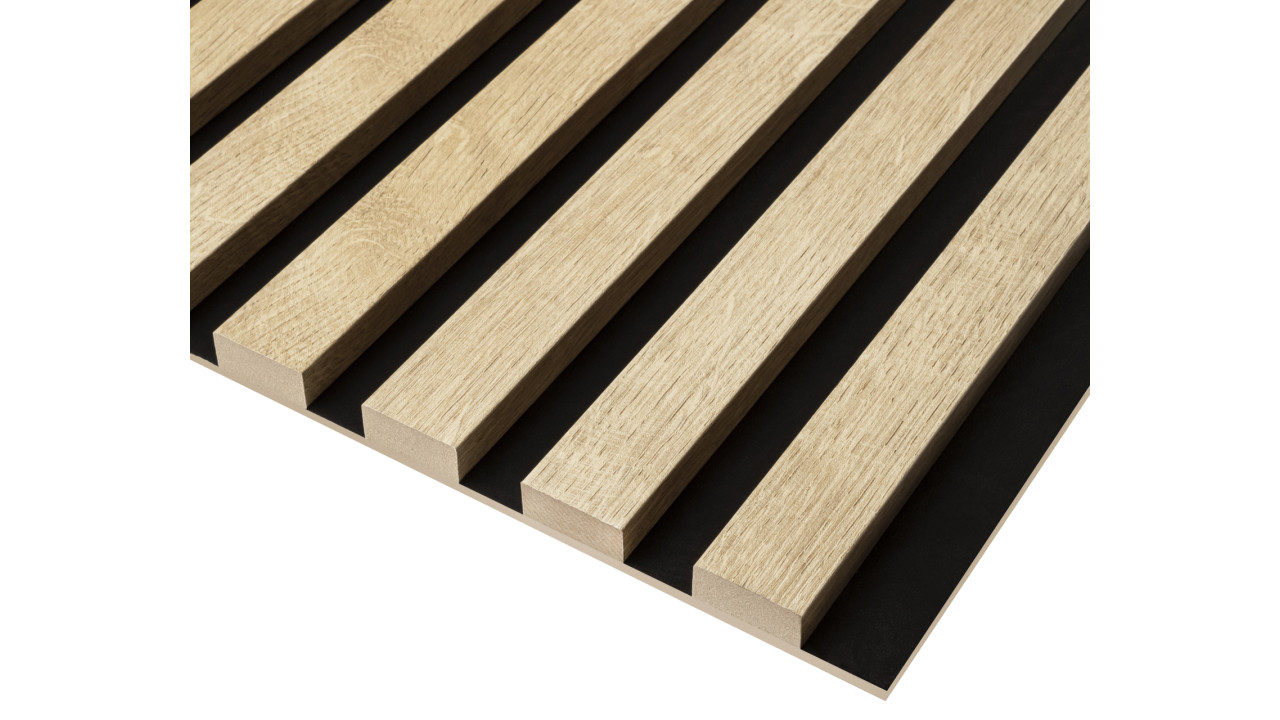 - Panel o wymiarach 275x40,5x1,46cm składający się z 9 szt. lameli w kolorze DĄB SANTA 661 przymocowanych do czarnej płyty HDF.