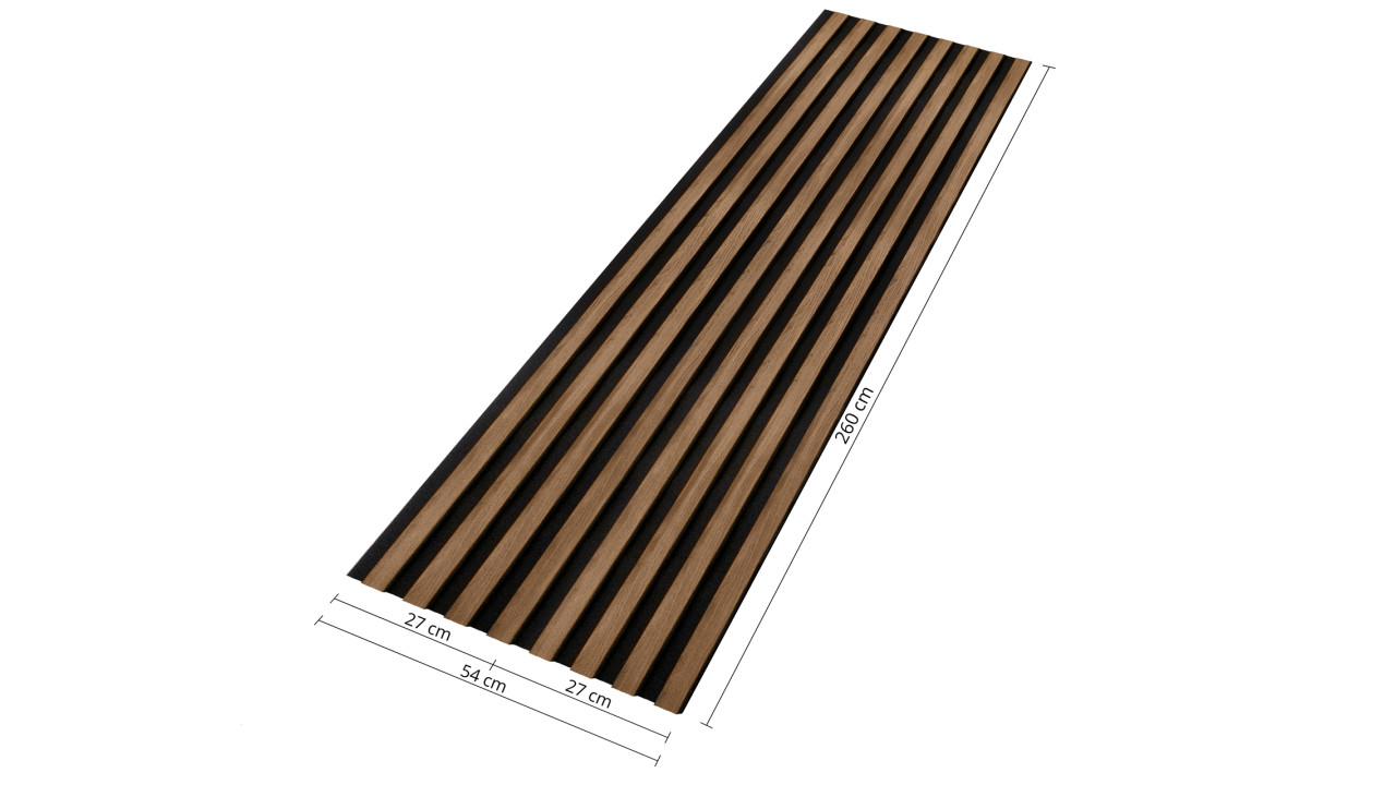 -2 sztuki paneli o wymiarach 260cm x 27cm składających się z czterech sztuk lameli (listew) w kolorze Ciemny Orzech 321 przymocowanych do czarnego filcu