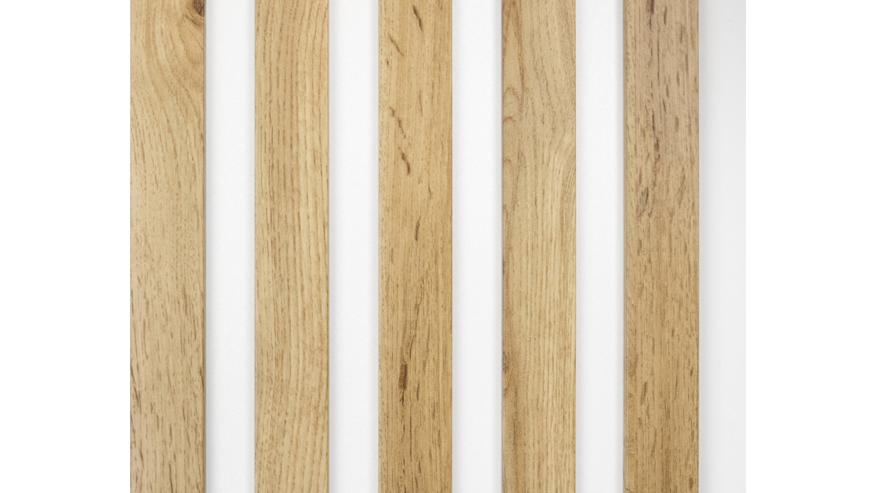 -2 sztuki paneli o wymiarach 275 cm x 27cm składających się z pięciu sztuk lameli (listew) w kolorze Dąb Wotan przymocowanych do białej płyty HDF oraz 2 moduły łącznikowe o wymiarach 275 cm x 3,1 cm ,umożliwiające estetyczne łączenie paneli na zakładkę.
